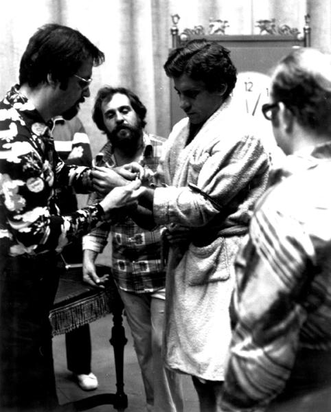 Harry Blackstone Jr. serves as Magic consultant on ABC Circle Films "the Great Houdinis" starring Paul-Michael Glaser and Sally Struthers. (below) Harry and Paul-Michael practice a handcuff escape. The property man (wish I could remember his name, he did a terrific job) and Abb Dickson, who owned some of the props, look on. |