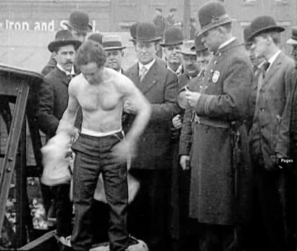 At a 1907 bridge jump, Kukol is right behind Houdini's right