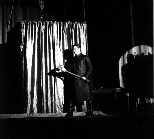 (above) Patrick Culliton as Franz Kukol standing by the cabinet, axe in hand.